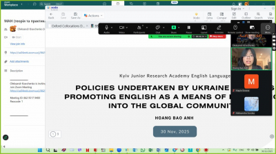 Завершальною доповідачкою стала Хоанг Бао Ань, яка представила ґрунтовний аналіз заходів, що нині впроваджуються в Україні для популяризації англійської мови як важливого чинника інтеграції у світову спільноту. Її виступ вирізнявся змістовністю та наявністю переконливих статистичних даних.