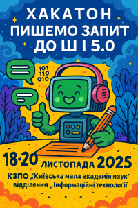 Вп’яте відділення інформаційних технологій Київської МАН запрошує талановиту, креативну та допитливу молодь закладів середньої освіти (учнів 8-11 класів старших 13 років), закладів вищої освіти (здобувачів першого курсу до 18 років включно), закладів фахової передвищої освітив (здобувачів до 18 років включно) взяти участь у хакатоні «Пишемо запит до ШІ 5.0», де учасники зможуть опанувати, продемонструвати та вдосконалити свої навички промпт-інжинірингу.