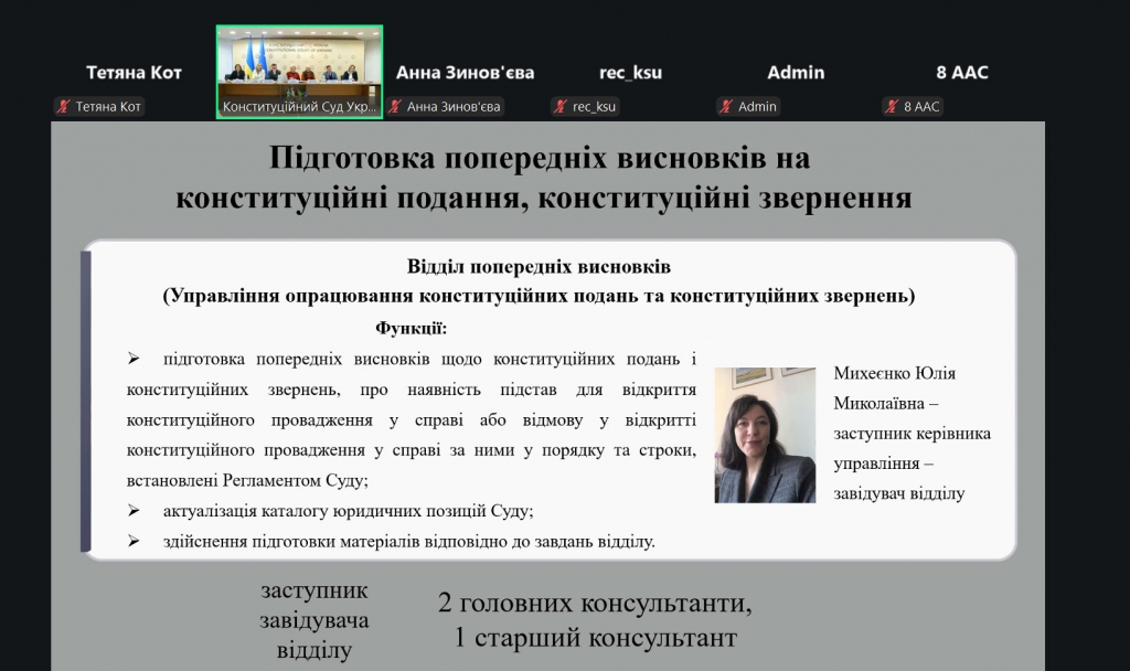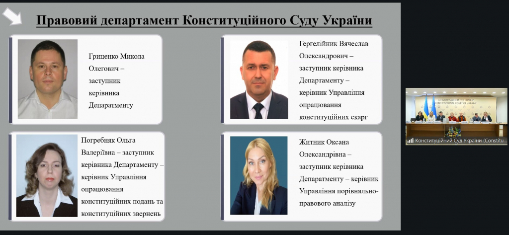 Участь у заході взяли судді Конституційного Суду України Юрій БАРАБАШ, Олександр ВОДЯННІКОВ, Галина ЮРОВСЬКА, керівники та працівники правового департаменту Секретаріату Суду – Управління опрацювання конституційних скарг, Управління опрацювання конституційних подань та конституційних звернень, Управління порівняльно-правового аналізу.