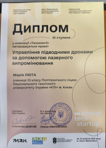 Марія ЛЮТА, учениця 10 класу Політехнічного ліцею НТУУ «КПІ» м.Києва отримала диплом III ступеня у номінації «Технології» з проєктом «Управління підводними дронами за допомогою лазерного випромінювання».