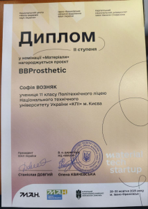Софія ВОЗНЯК, учениця 11 класу Політехнічного ліцею НТУУ «КПІ» м. Києва отримала диплом II ступеня у номінації «Матеріали» з проєктом BBProsthetic.