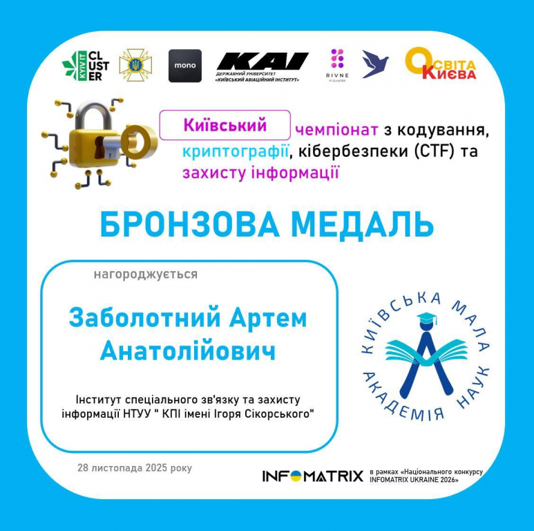 - Заболотний Артем Анатолійович, Інститут спеціального зв'язку та захисту інформації НТУУ "КПІ імені Ігоря Сікорського"