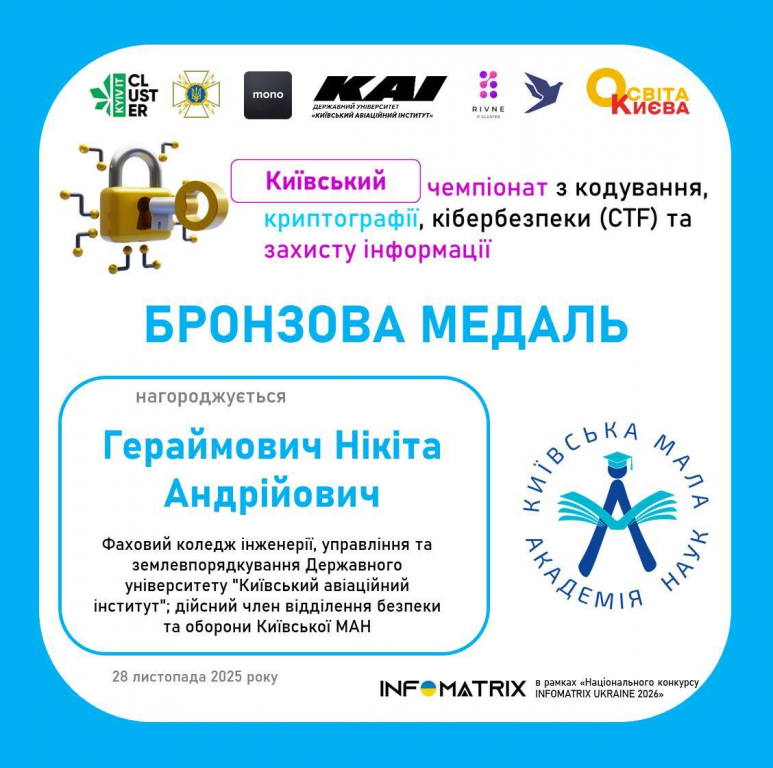 - Гераймович Нікіта Андрійовичу, Фаховий коледж інженерії, управління та землевпорядкування Державного університету "Київський авіаційний інститут"; дійсний член відділення безпеки та оборони Київської МАН