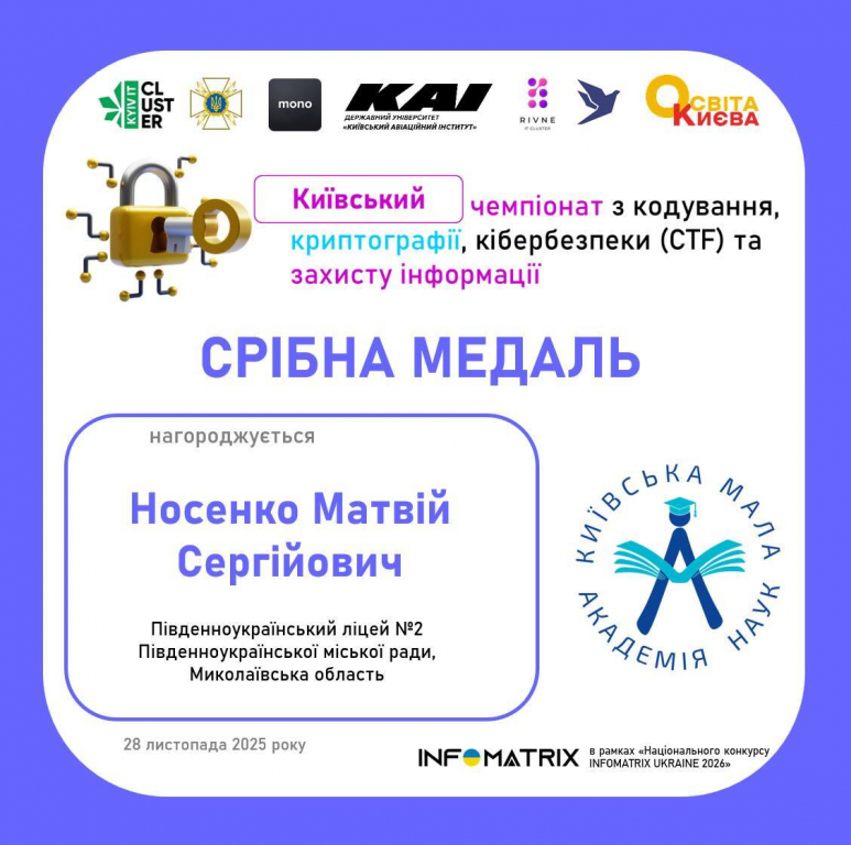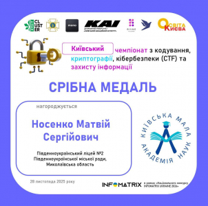- Носенко Матвій Сергійович, Південноукраїнський ліцей №2 Південноукраїнської міської ради Миколаївської області