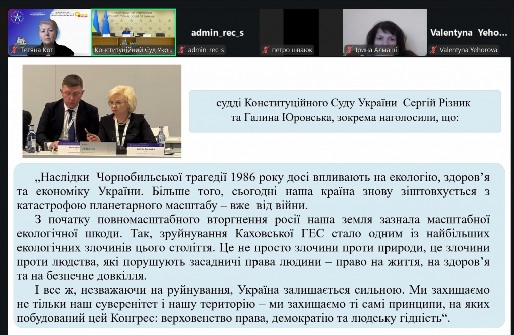 Суддя Конституційного Суду України Ольга Совгиря, яка модерувала першу сесію VI Конгресу Конференції присвячену тематиці збереження природних ресурсів та довкілля, зазначила, що війна російської федерації проти України спричинила масштабну екологічну катастрофу, яка є злочином не лише проти природи, а й проти людства. Вона підкреслила нерозривний зв’язок між екологічними правами людини, правом на життя та верховенством права.