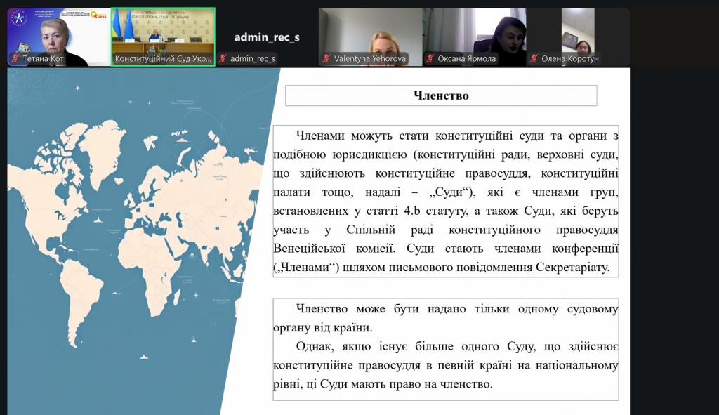 Пані Юровська поінформувала учасників заходу, що I Конгрес відбувся в січні 2009 року в Південно-Африканській Республіці. У ньому взяли участь 90 судових органів з усього світу, які ухвалили першу підсумкову декларацію про важливість глобального обміну конституційними практиками та започаткували Всесвітню асоціацію конституційних судів. Суддя додала, що у 2011 році в Бразилії було затверджено Статут Всесвітньої конференції конституційного правосуддя, а вже в травні того ж року у Венеції – остаточну редакцію документа. Конституційний Суд України приєднався до Конференції з моменту її створення і є активним учасником усіх наступних конгресів.