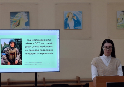 Добрунова Анна, учениця 11 класу ТОВ «Центр освіти Оптіма», тема: «Життєвий шлях та участь у бойових діях Олени Чебоненко як приклад жіночого героїзму в сучасній російсько-українській війні».