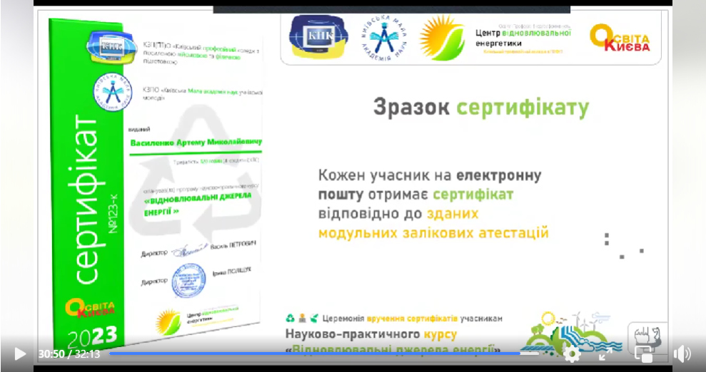 30 січня 2023 року відбулась церемонія вручення сертифікатів слухачам курсу «Відновлювальні джерела енергії», яку можна переглянути: