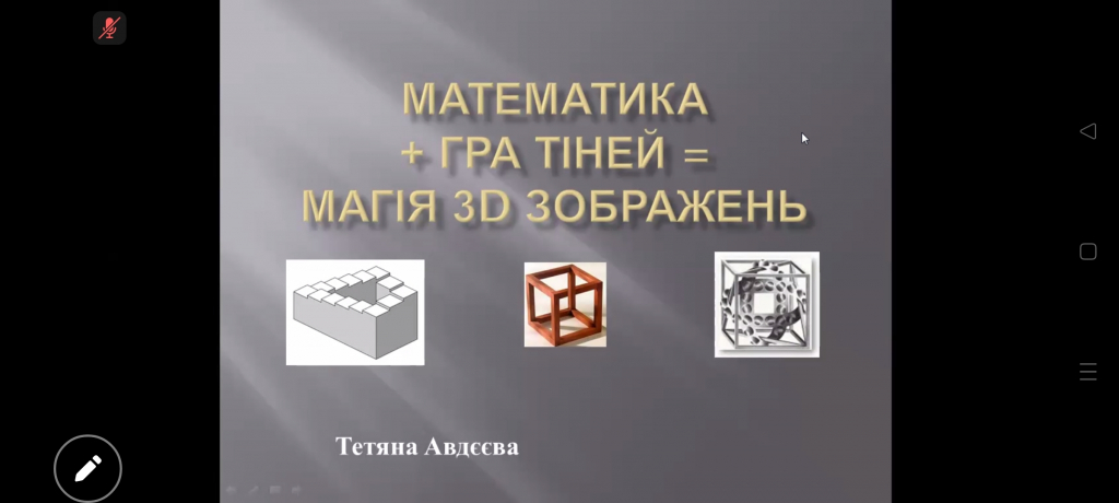 Фінальний семінар від Тетяни Авдєєвої об'єднав геометрію та мистецтво, пояснюючи, як ми бачимо об'ємний світ на пласких поверхнях, як за допомогою геометрії (зокрема нарисної) тривимірні об'єкти трансформуються у двовимірні зображення, а також які секрети перспективи та анаморфози (зображення, що стають зрозумілими лише під певним кутом) існують в геометрії. Розуміння принципів роботи комп’ютерної графіки, архітектурного проектування та сучасного 3D-арту є надзвичайно корисним в сучасному світі.