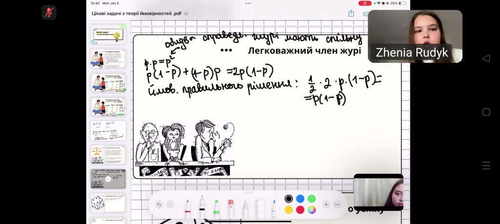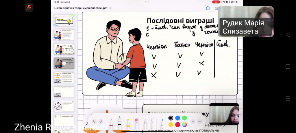 Вже на перших заняттях учасники дізнались про таємниці теорії ймовірностей від Євгенії Анастасії Рудик, випускниці Київської МАН, Марії Єлизавети Рудик, вихованки відділення математики та Мирослави Литвин, випускниці Київської МАН (наразі вона є керівником секції математики). Учасники Зимової школи спостерігали, як моделюються поняття ймовірності дослідженням випадкових подій, випробувань та їх результатів для розрахунку можливості настання певних подій, через сучасну комп'ютерну гру. Вчилися розуміти, як в умовах невизначеності прийняти правильне рішення та проаналізувати ризики у повсякденному житті для розуміння наслідків дій.