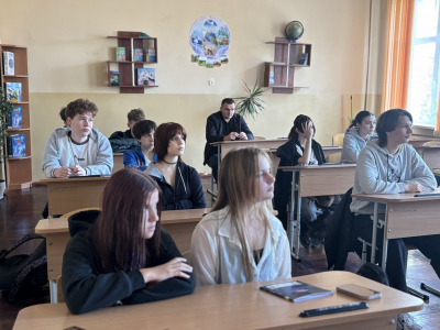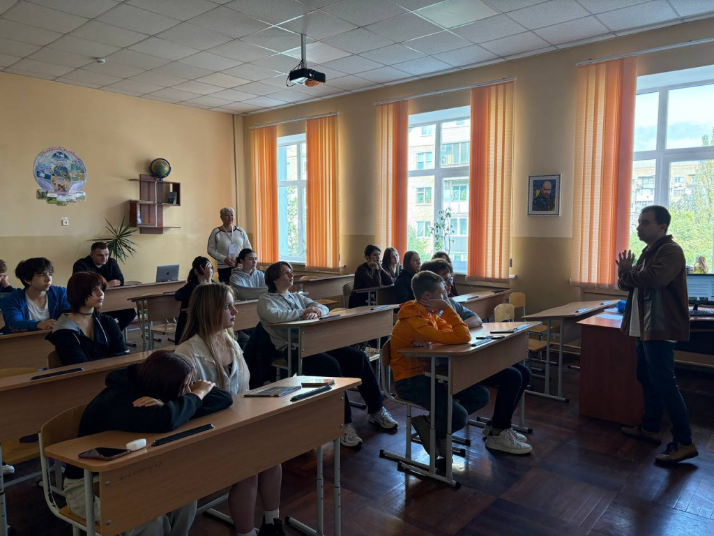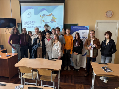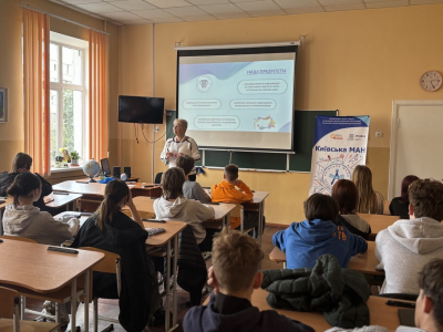 Тетяна КОТ, керівниця секції правознавства, та Сергій РУСАКОВ, керівник секції «Філософія. Культурологія», зустрілись зі школярами, розповіли про основні напрями роботи відділення, про науковий шлях, на який варто ступити, про всі переваги та перспективи навчання у Київській МАН, про можливості, які відкриваються для кожного та кожної в Київській МАН.