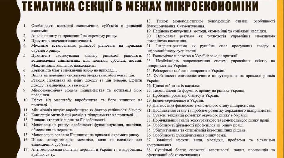 Запрошуємо учнів долучатись до секції «Мікроекономіки та макроекономіки», вивчати взаємодію окремих економічних суб’єктів та досліджувати механізм функціонування конкретних ринків, а також закономірності функціонування економіки країни в цілому або її частини, наприклад, галузі.