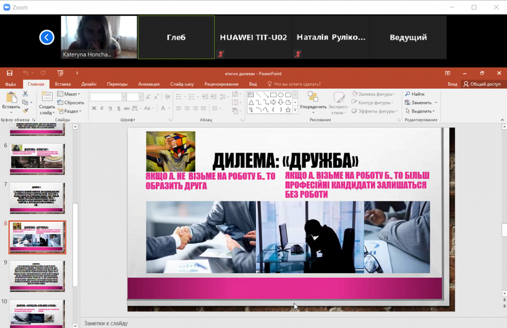 Спочатку детально з’ясували, що ж таке саме поняття «дилеми». На прикладі етичних дилем «Плагіат», «Дружба», «Самокероване авто» спробували зрозуміти, що таке вибір в складній ситуації, чи має місце в них «свобода вибору» та чи існує «вибір без вибору». Також під час онлайн-обговорення ознайомились із етичними дилемами, на які чекає людство у найближчому майбутньому – дилемою «Нейронет» («brain-to-brain interface»), дилемою «Cheetah Flex-Foot» та найбільш відомими з невирішених дилем.