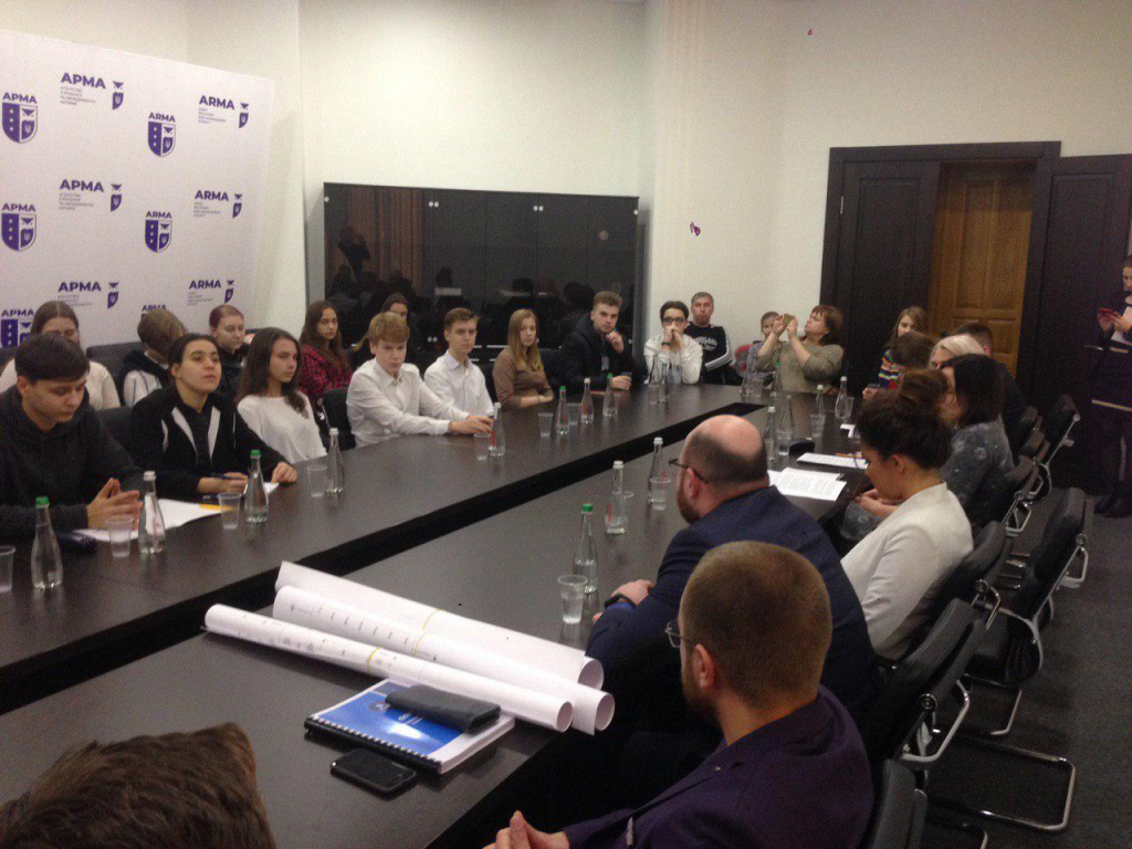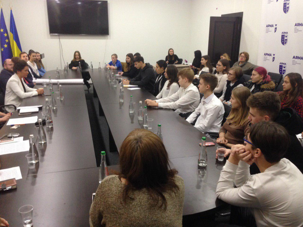 За круглим столом зібралися більше 10 ключових співробітників Агенства - по одному з кожного підрозділу -- та близько 30 учнів 6-11 класiв, включаючи учнів з особливими освітніми потребами. Головна мета півторагодинної зустрічі з КМАНівцями - сприяння формуванню правової культури та правової свідомості молодого покоління, підвищення рівня знань молоді щодо гарантованих Конституцією та законами України прав та відповідальності за порушення Законів. Для школярів організували навчальну бесіду, під час якої розказали про реалізацію та захист законних прав, проблеми корупції в Україні та шляхи боротьби з нею, роль та функції AРMA, її історію та досягнення, основні структурні підрозділи, напрями та методи роботи, кваліфікаційні вимоги до співробітників тощо. Юні правознавці та економісти задавали експертам безліч непростих питань, одержували компетентні відповіді з перших вуст. Спілкування носило динамічний, щирий та змістовний характер.